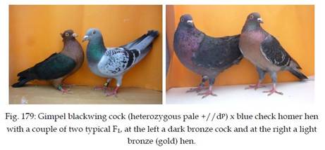 heterozygous Copper/Gold Blackwing and a blue check Racing Homer (at