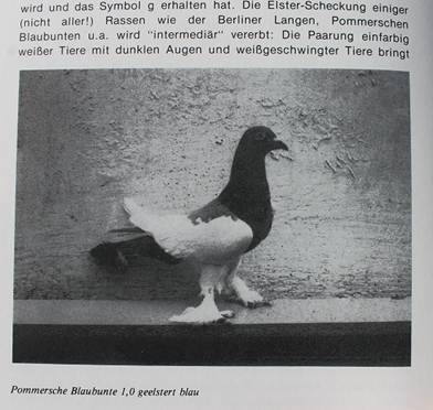 (Pomeranian 'Magpie' in the author's booklet 'Vererbung bei Tauben'