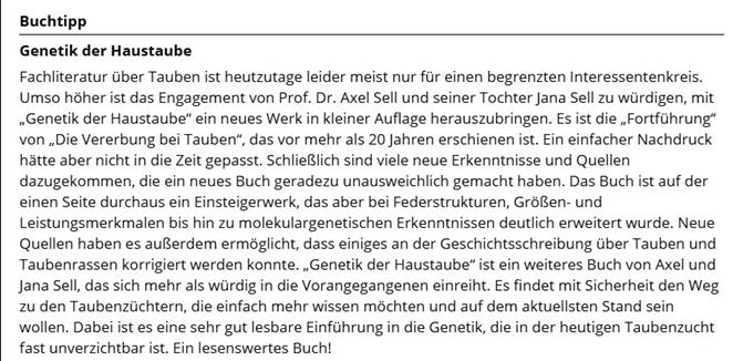 Axel Sell und Jana Sell, Genetik der Haustaube. 196 Seiten, 350