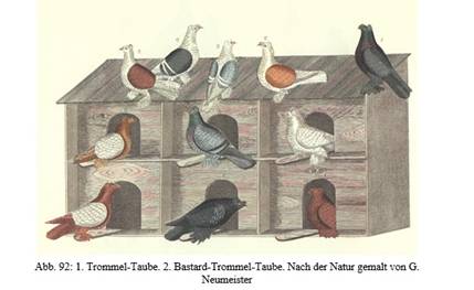 Neumeister zeigte 1837 Kreuzungen von Trommeltauben mit Farbentauben