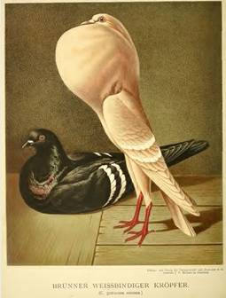 Bei Prütz 1885 abgebildet ein glattfüßiger Brünner Kröpfer. Dahinter